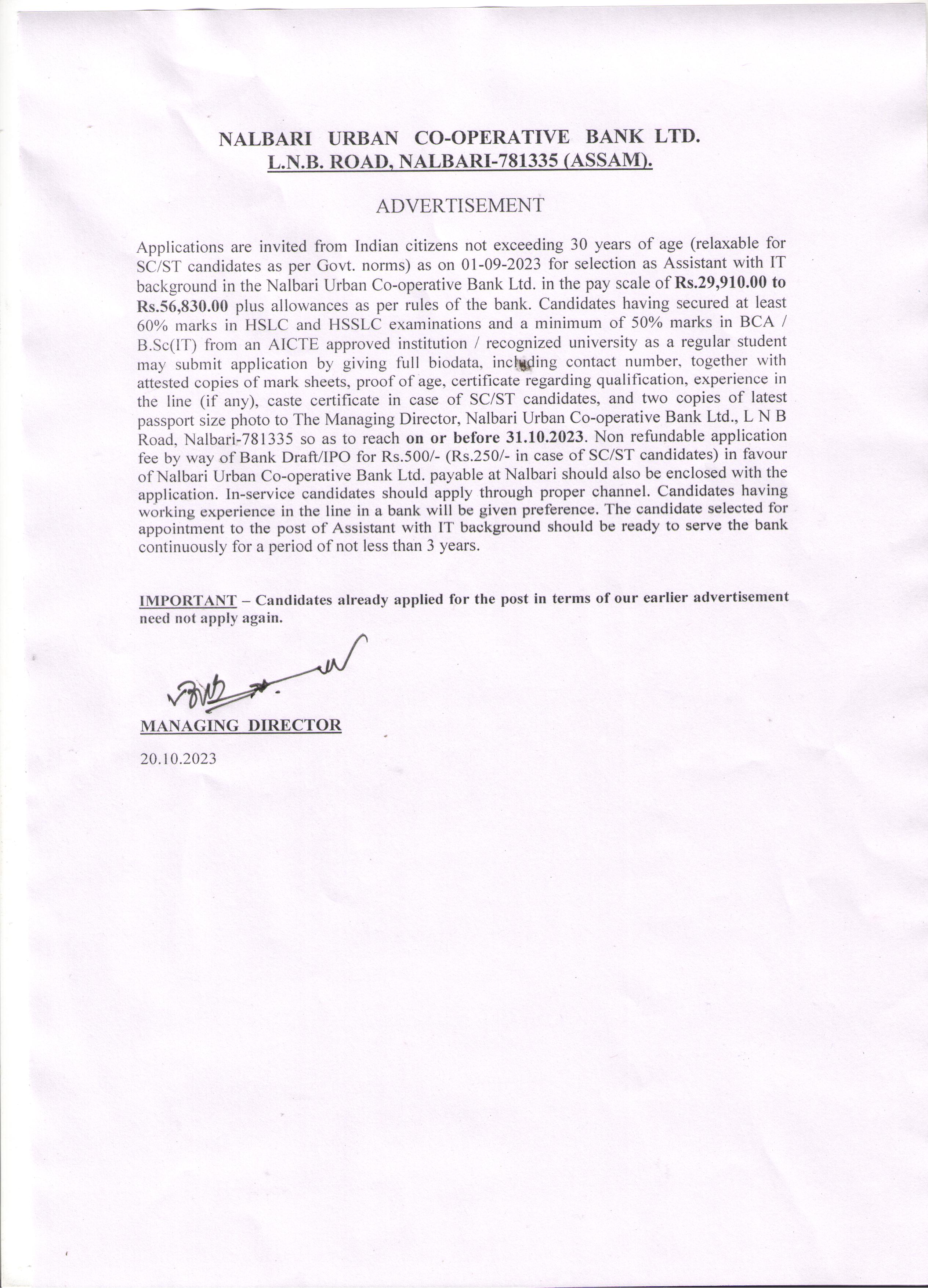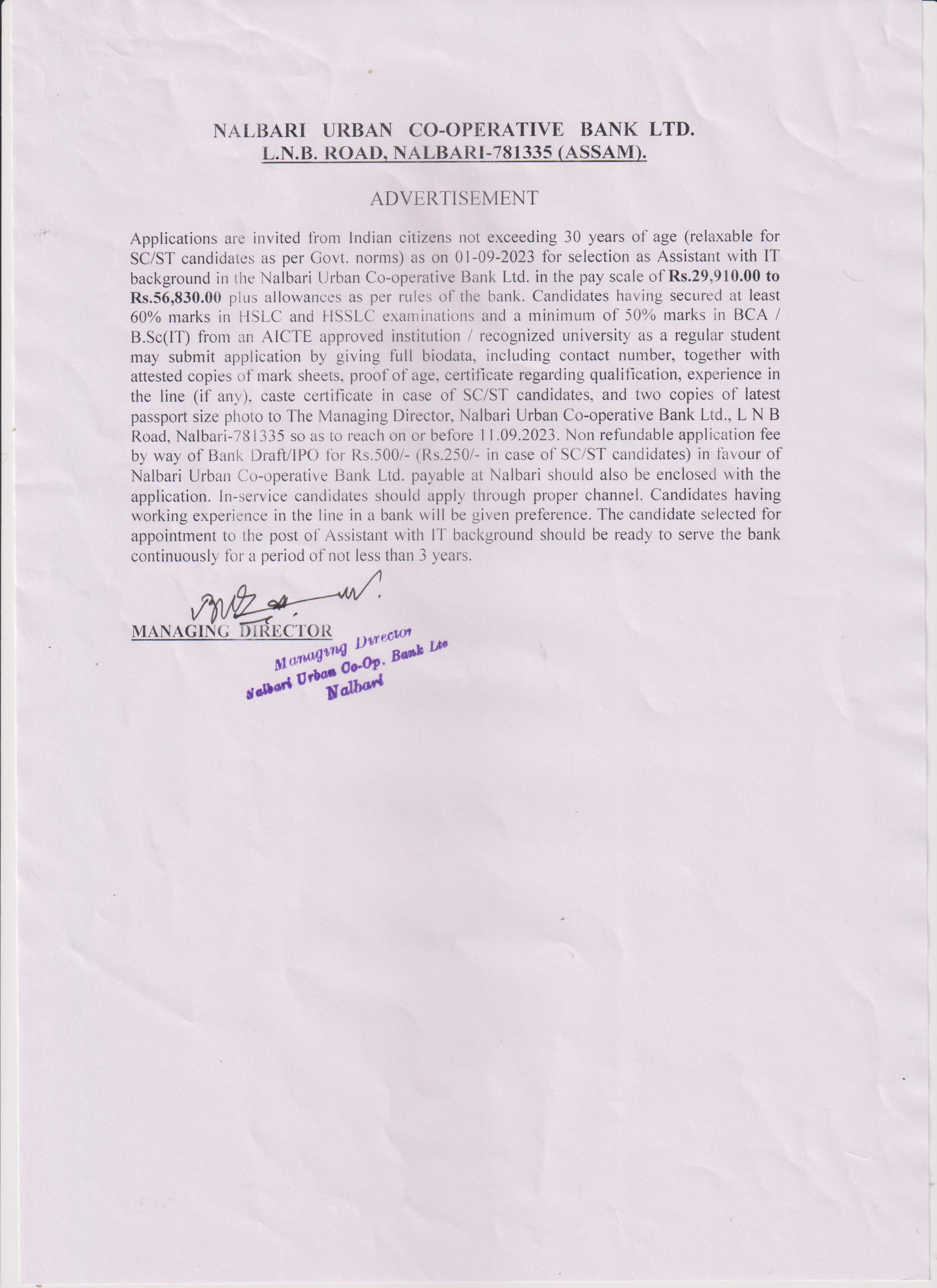 Advertisement for the Post of Assistant with IT background