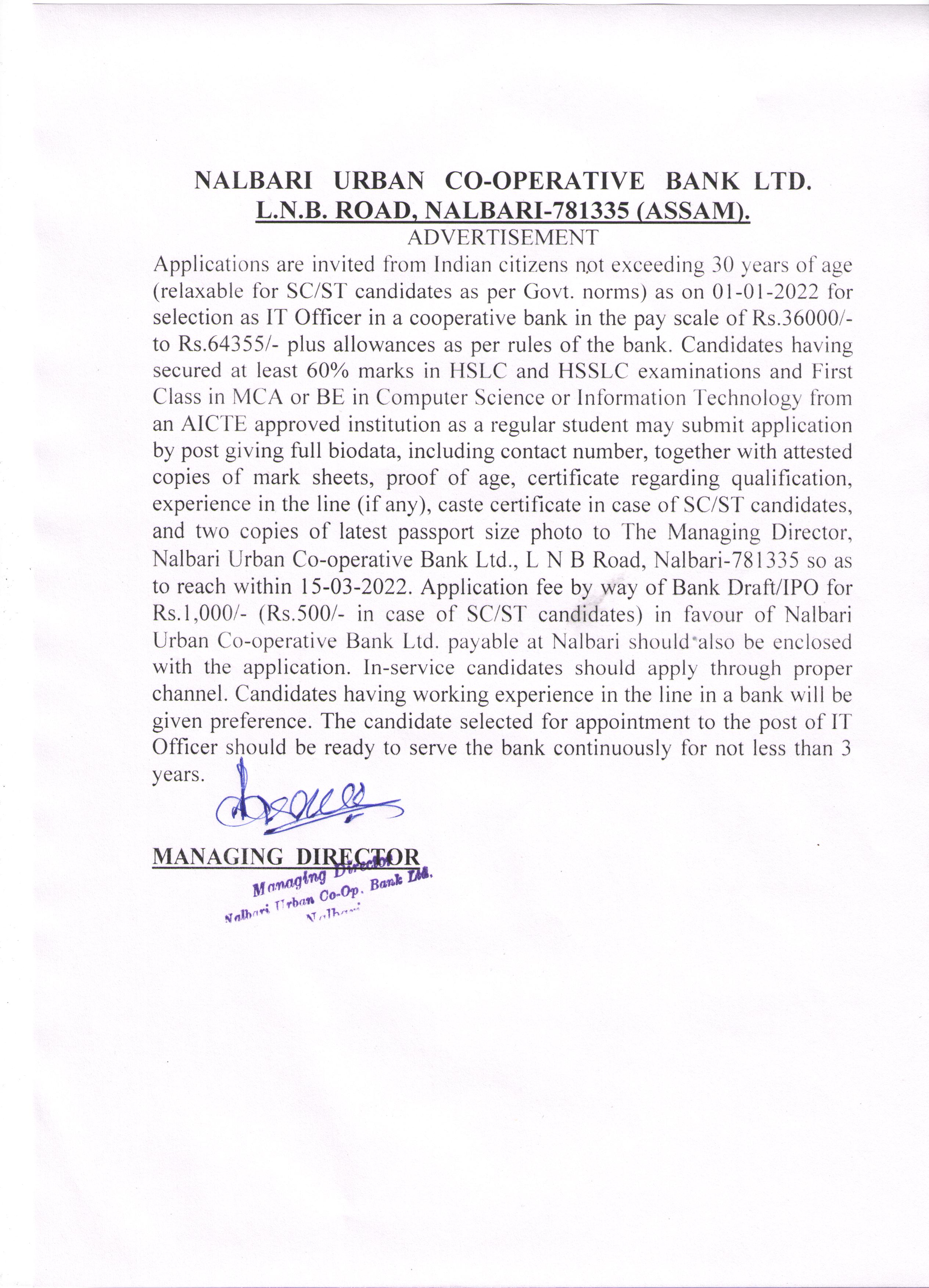 Advertisement for the Post of IT officer