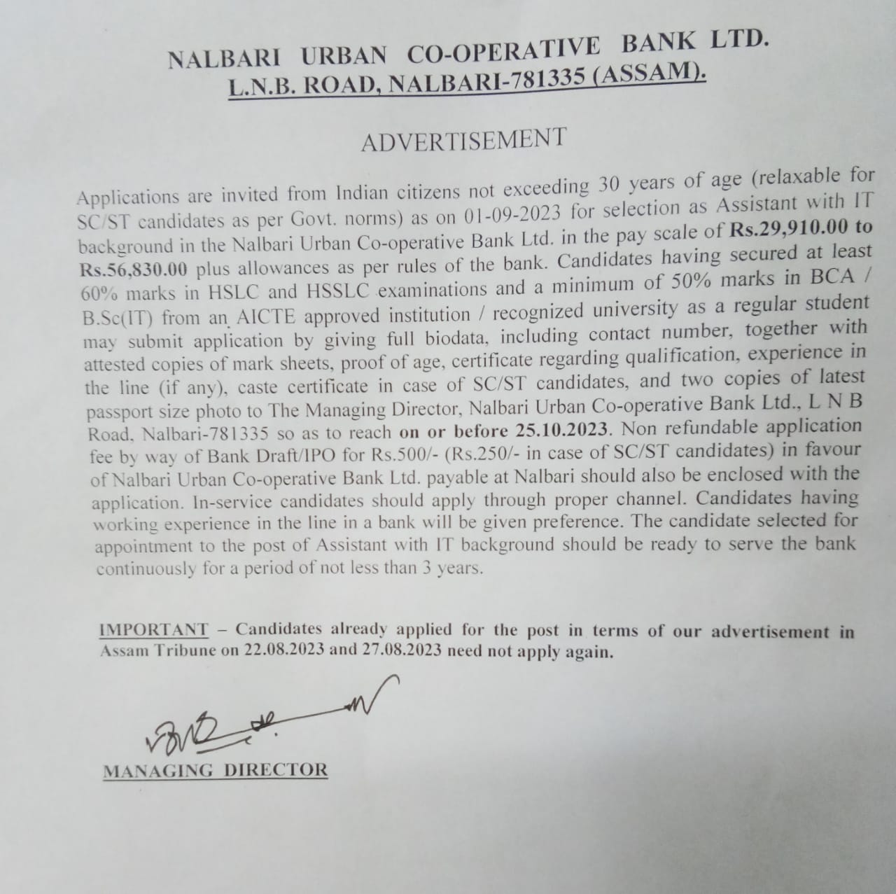 Re Advertisement for the Post of Assistant with IT background